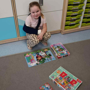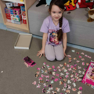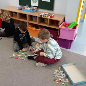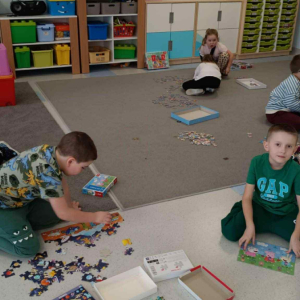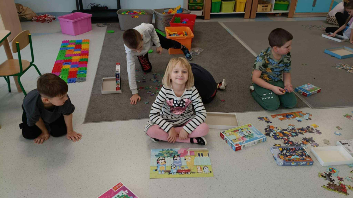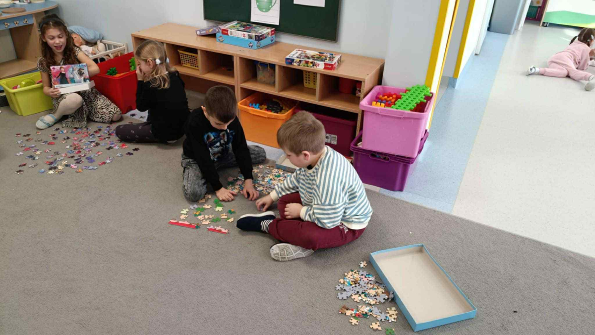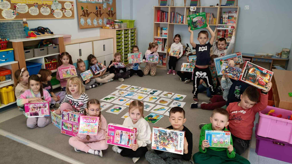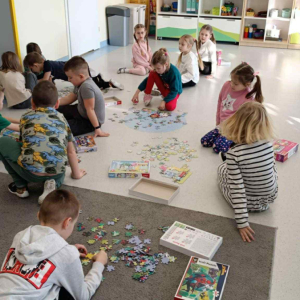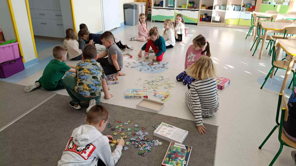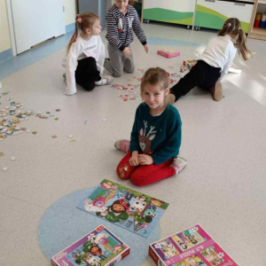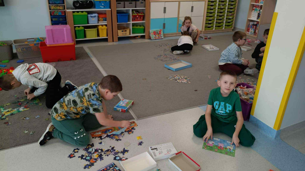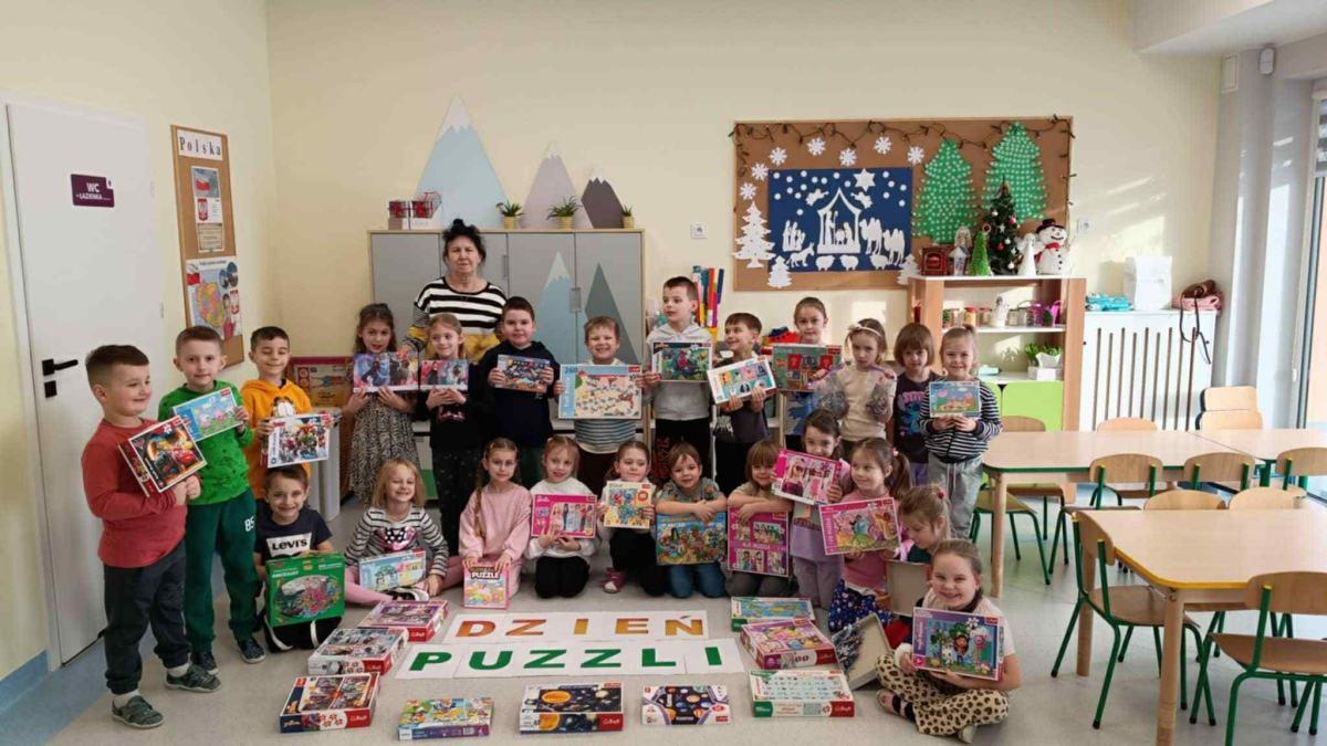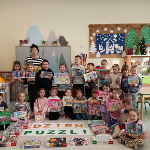 Dzień Puzzli w przedszkolu, to doskonała okazja do nauki przez zabawę, rozwijająca koncentrację, pamięć wzrokową, logiczne myślenie oraz motorykę małą. W tym dniu dzieci przyniosły do przedszkola swoje ulubione układanki, brały udział w licznych konkursach i zabawach