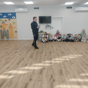 W naszym przedszkolu odbyło się wyjątkowe spotkanie z policjantem, które było poświęcone bezpieczeństwu babć i dziadków.