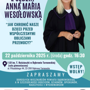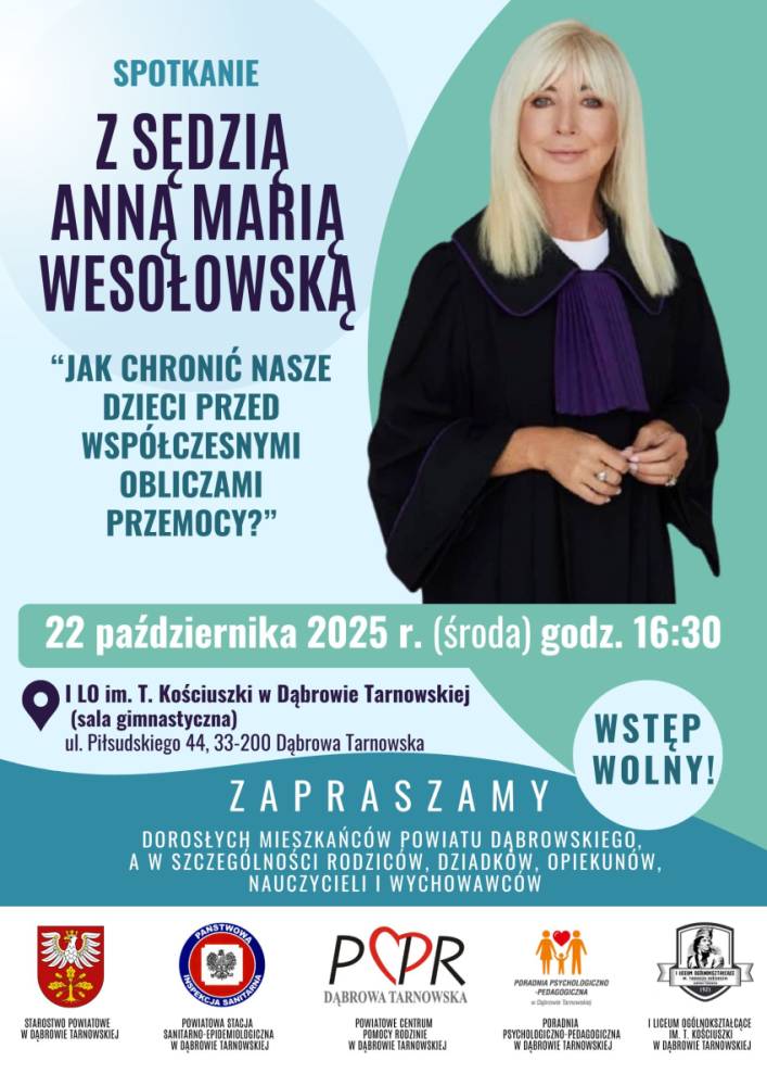 Zachęcamy do udziału w spotkaniu z sędzią Anną Marią Wesołowską ph. „Jak chronić nasze dzieci przed współczesnymi obliczami przemocy?”, które odbędzie się w środę 22 października 2025 r. o godz. 16:30 na sali gimnastycznej dąbrowskiego „ogólniaka” (ul. Piłsudskiego 44,33-200 Dąbrowa Tarnowska).