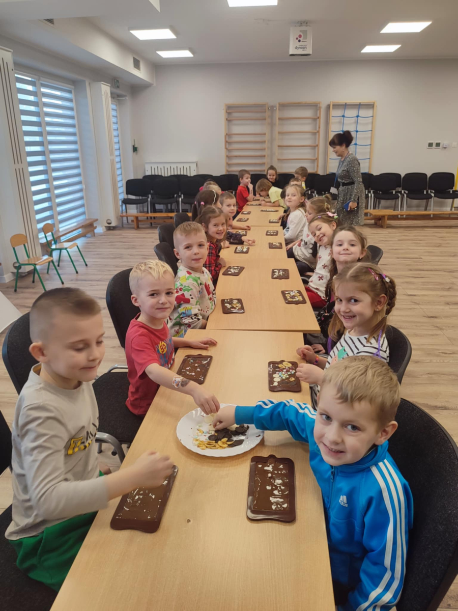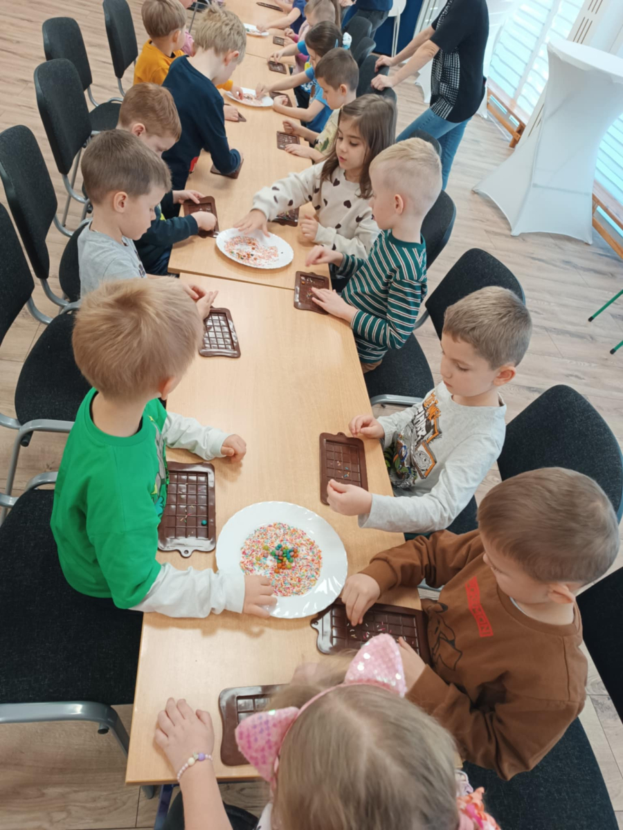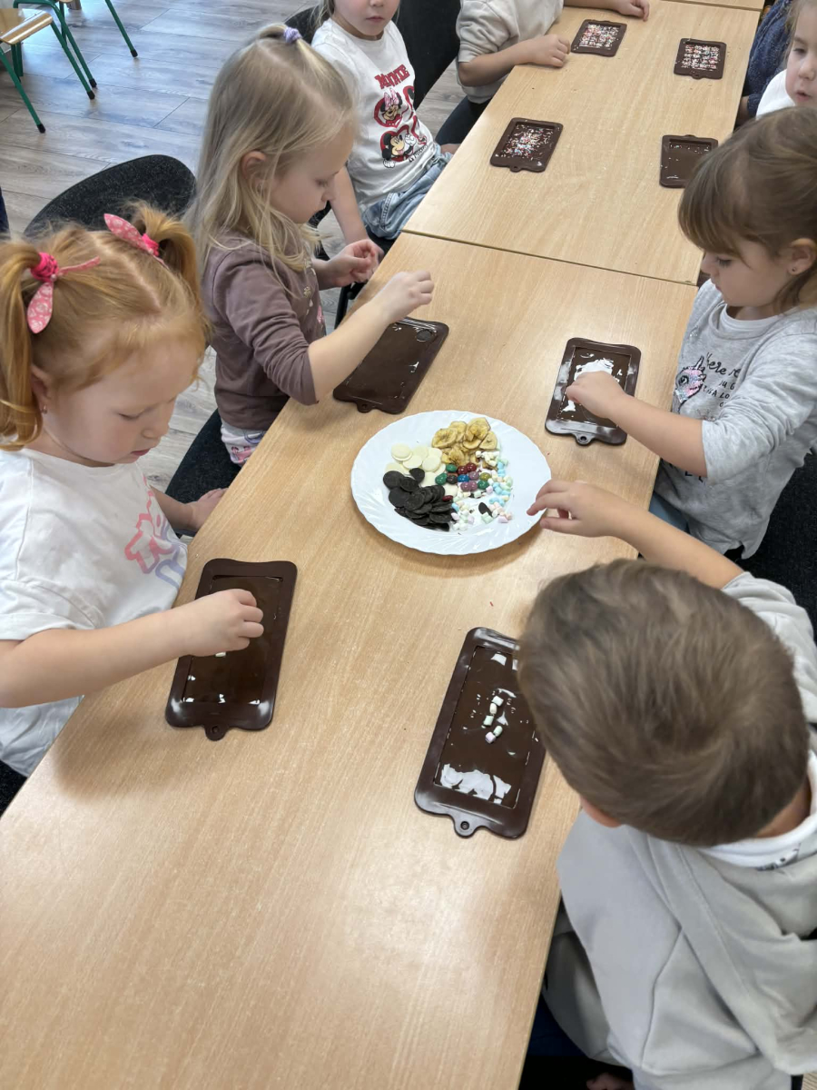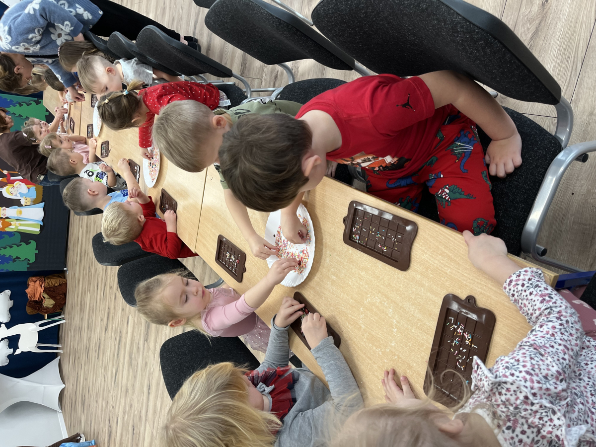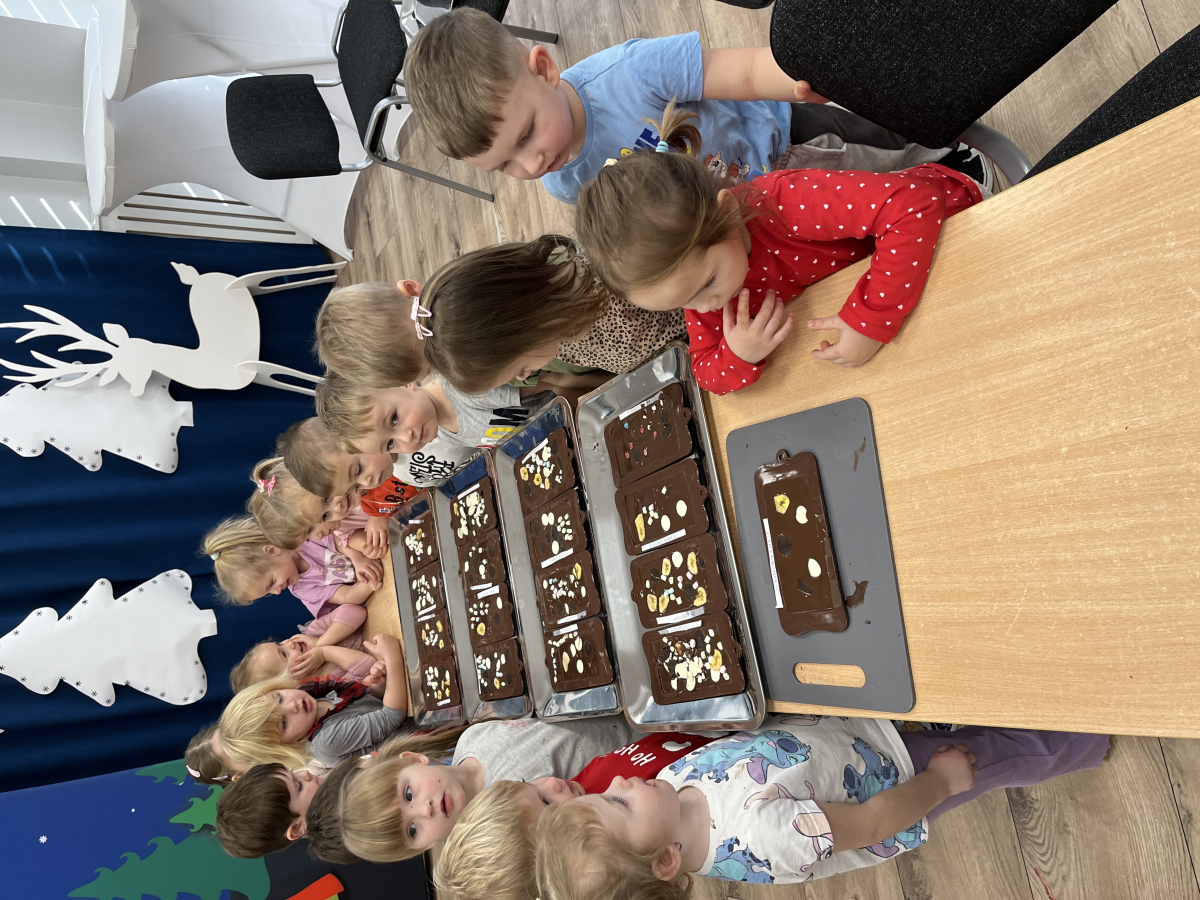 W dniu 19.12.2025 w naszym przedszkolu odbyły się wyjątkowe "Warsztaty czekoladowe" . Dzieci z dużym zainteresowaniem poznały, jak powstaje czekolada, oraz wzięły udział w słodkich i kreatywnych zajęciach. Każdy przedszkolak miał okazję samodzielnie ozdobić czekoladowe przysmaki, rozwijając przy tym wyobraźnię i zdolności manualne.