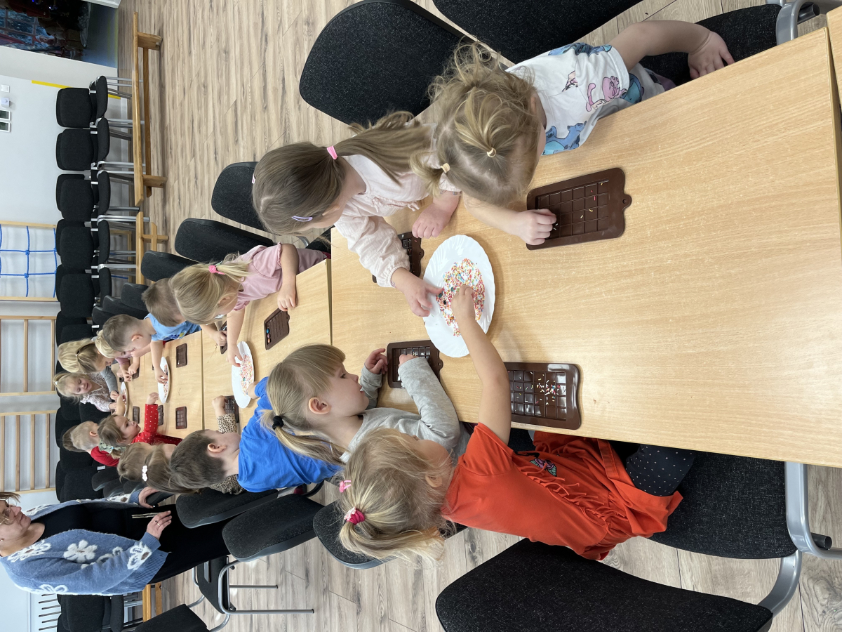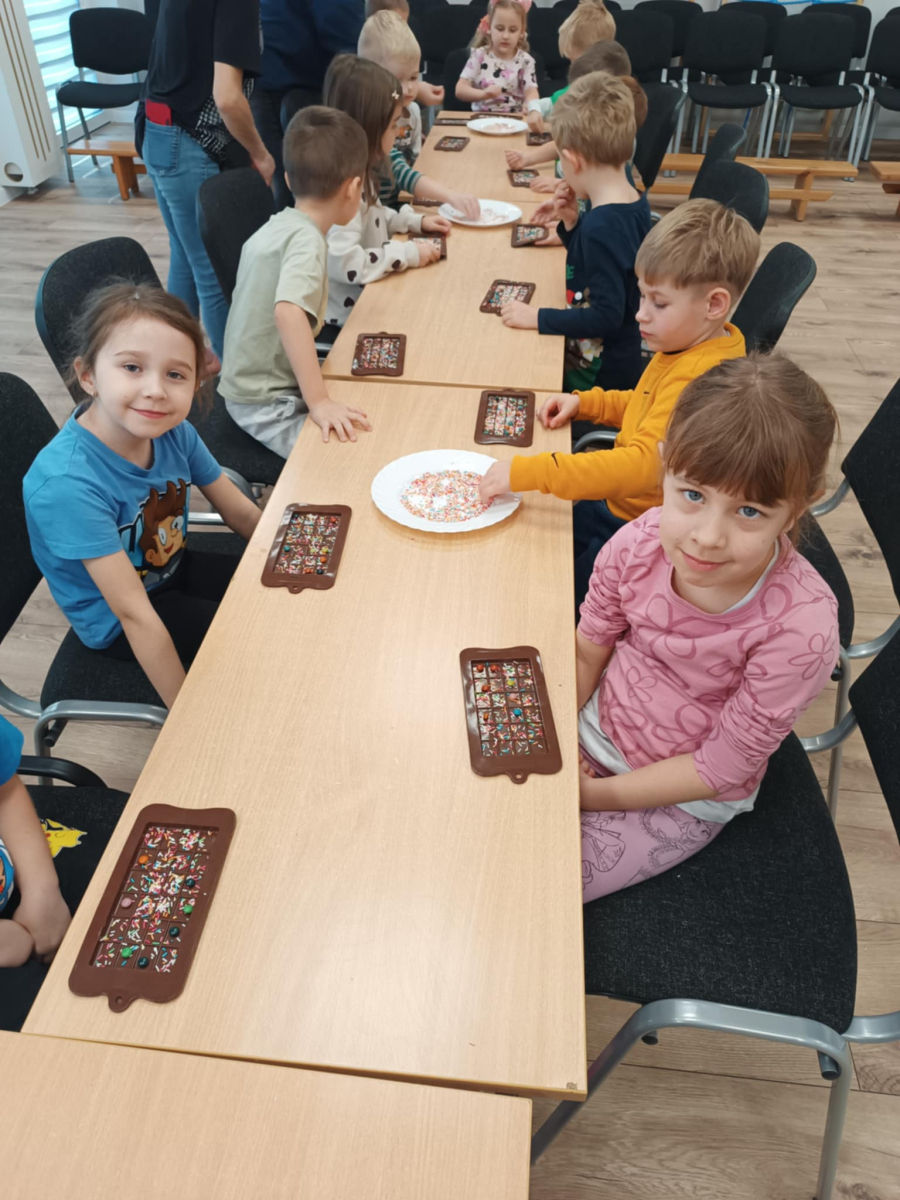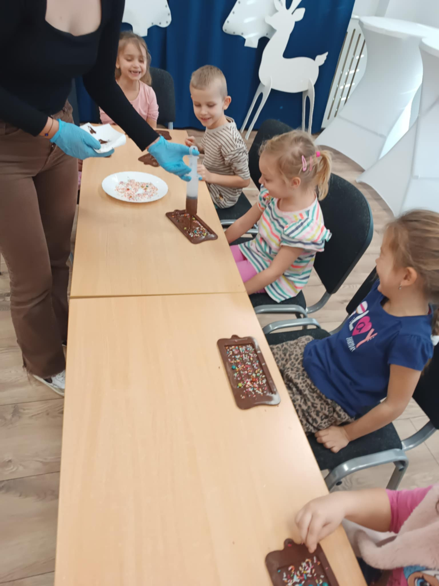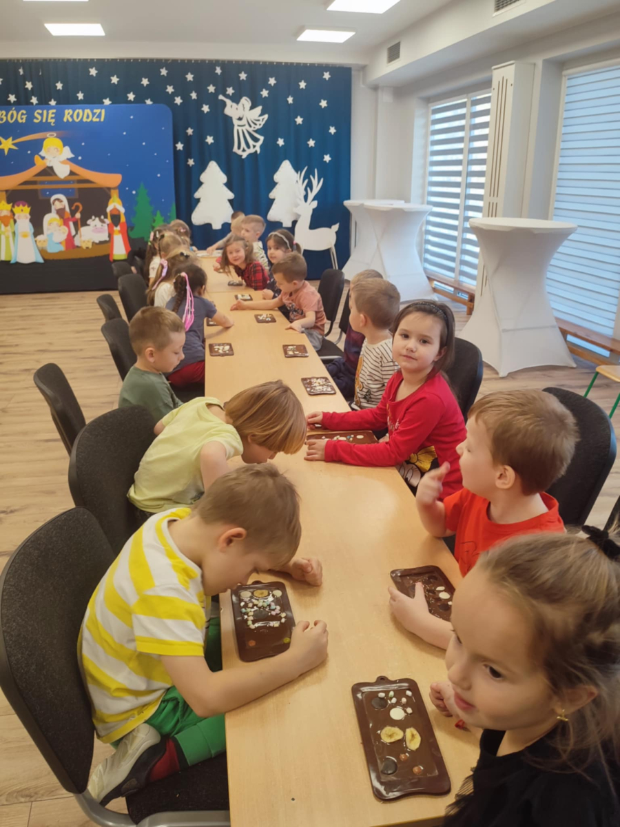 W dniu 19.12.2025 w naszym przedszkolu odbyły się wyjątkowe "Warsztaty czekoladowe" . Dzieci z dużym zainteresowaniem poznały, jak powstaje czekolada, oraz wzięły udział w słodkich i kreatywnych zajęciach. Każdy przedszkolak miał okazję samodzielnie ozdobić czekoladowe przysmaki, rozwijając przy tym wyobraźnię i zdolności manualne.