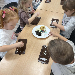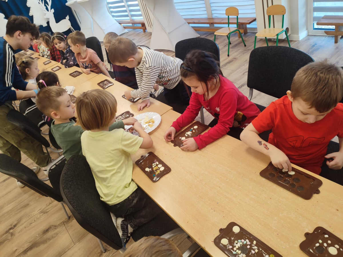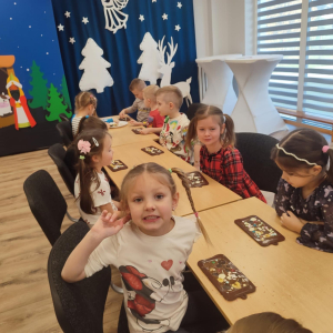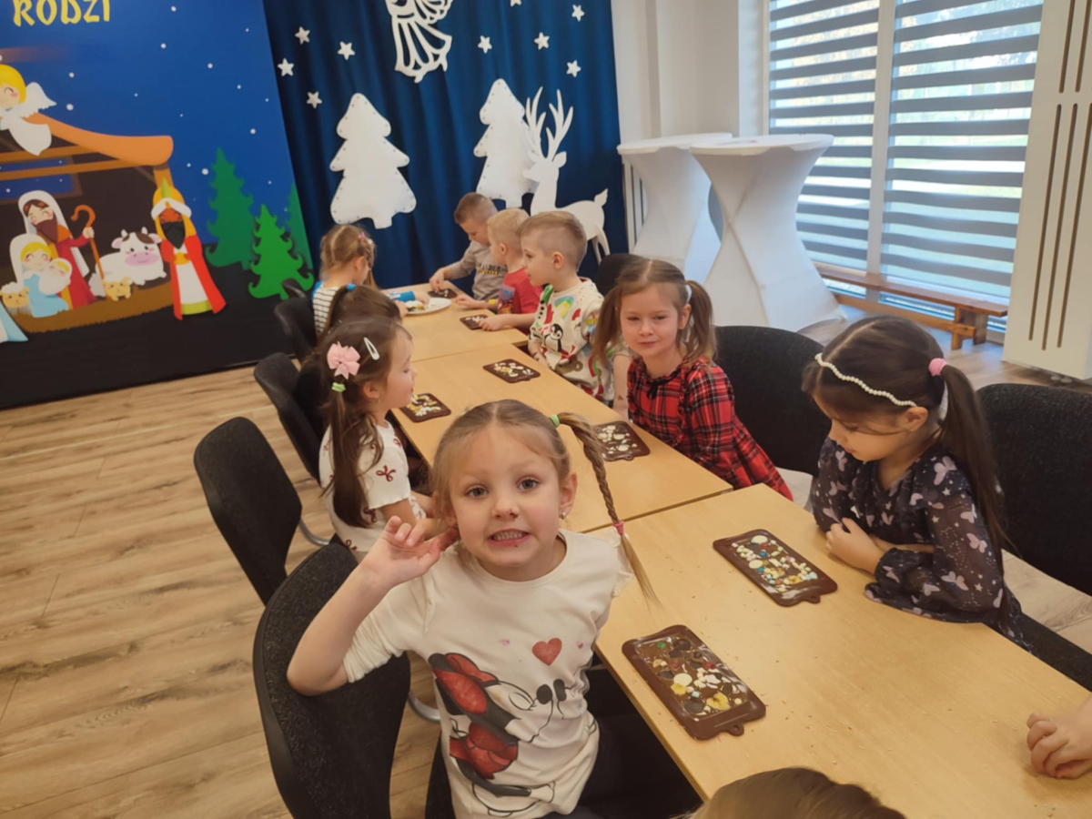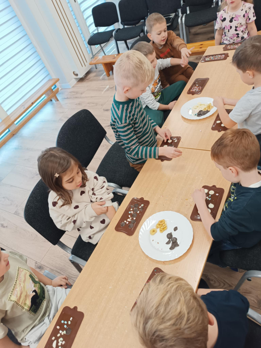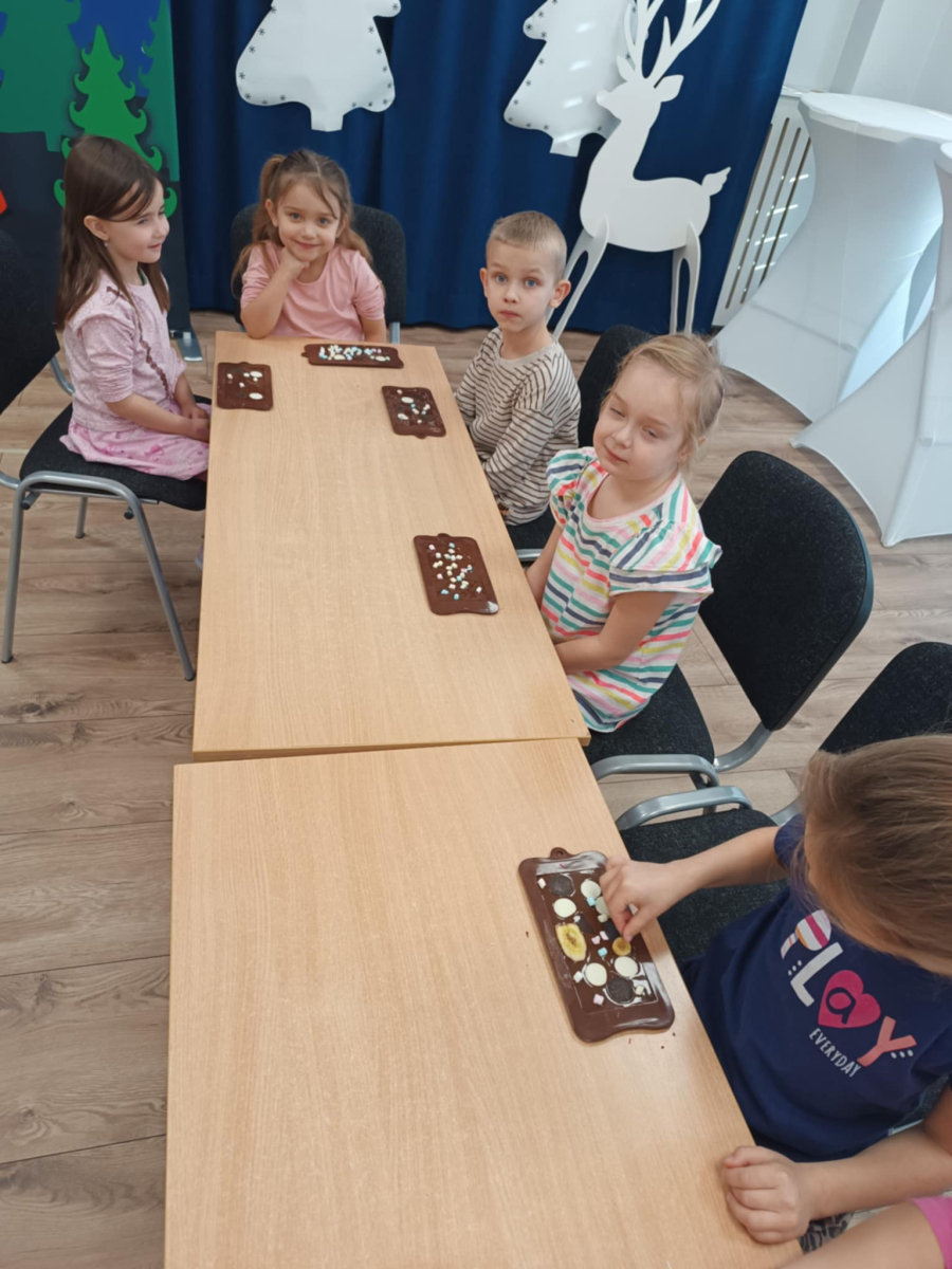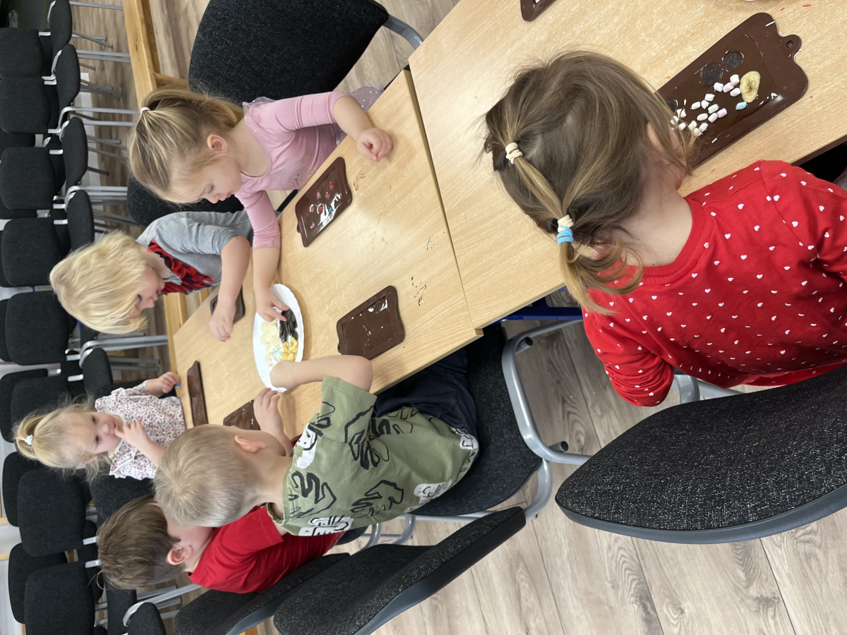 W dniu 19.12.2025 w naszym przedszkolu odbyły się wyjątkowe "Warsztaty czekoladowe" . Dzieci z dużym zainteresowaniem poznały, jak powstaje czekolada, oraz wzięły udział w słodkich i kreatywnych zajęciach. Każdy przedszkolak miał okazję samodzielnie ozdobić czekoladowe przysmaki, rozwijając przy tym wyobraźnię i zdolności manualne.