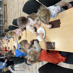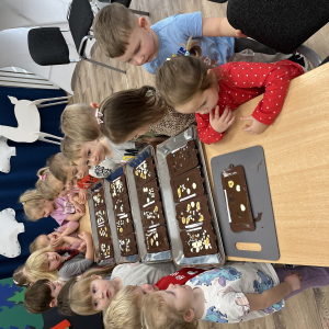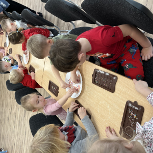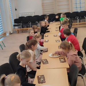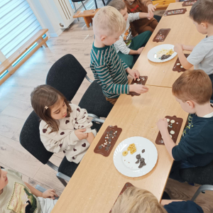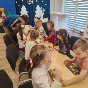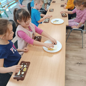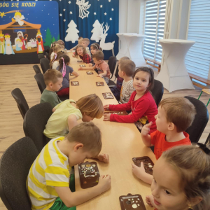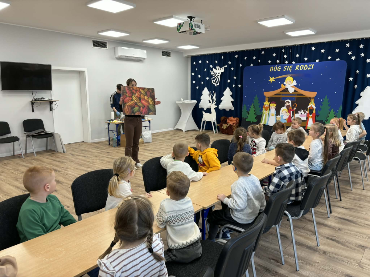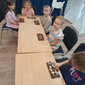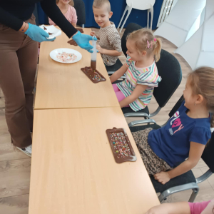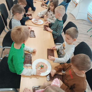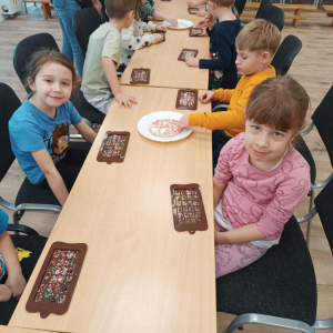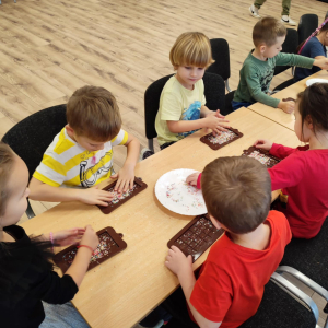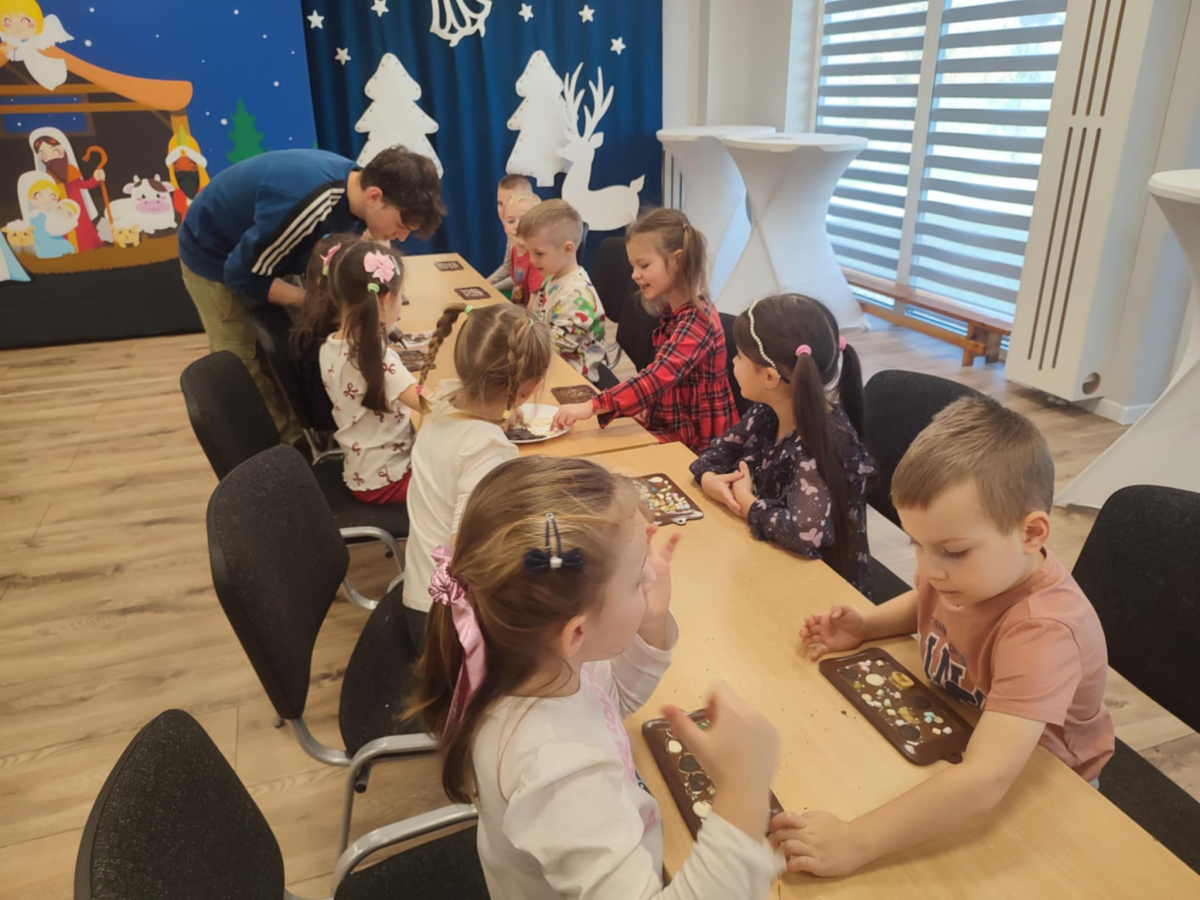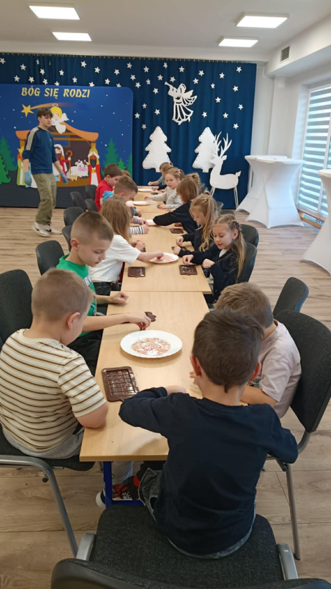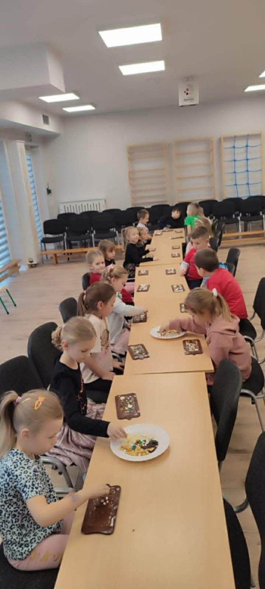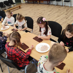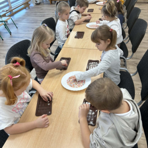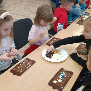 W dniu 19.12.2025 w naszym przedszkolu odbyły się wyjątkowe "Warsztaty czekoladowe" . Dzieci z dużym zainteresowaniem poznały, jak powstaje czekolada, oraz wzięły udział w słodkich i kreatywnych zajęciach. Każdy przedszkolak miał okazję samodzielnie ozdobić czekoladowe przysmaki, rozwijając przy tym wyobraźnię i zdolności manualne.