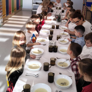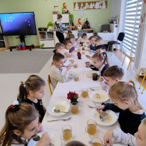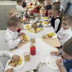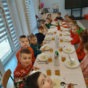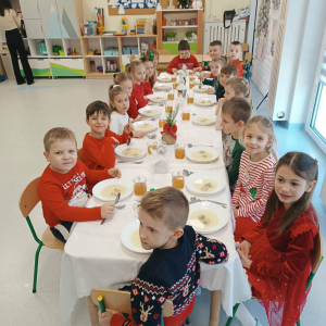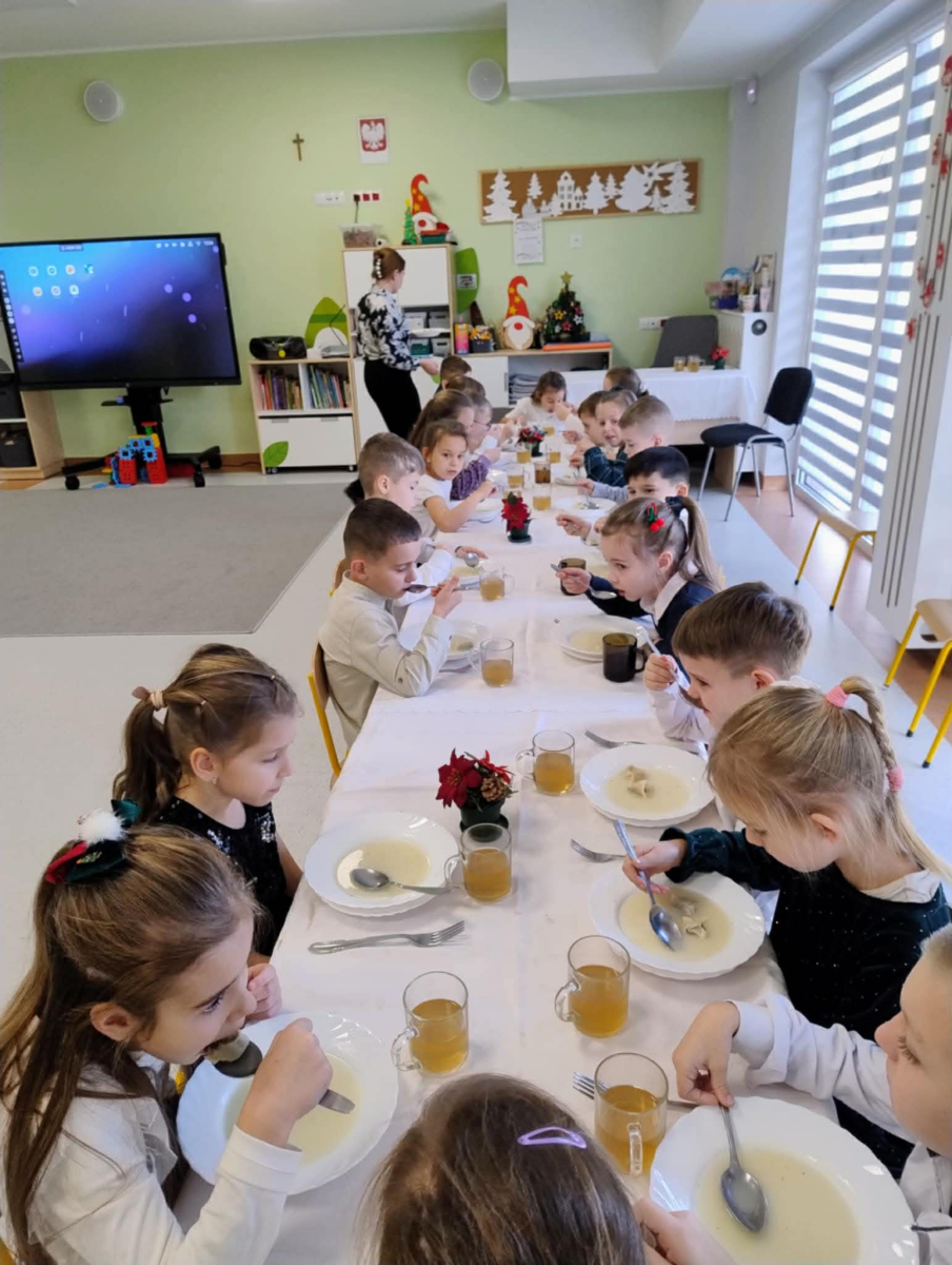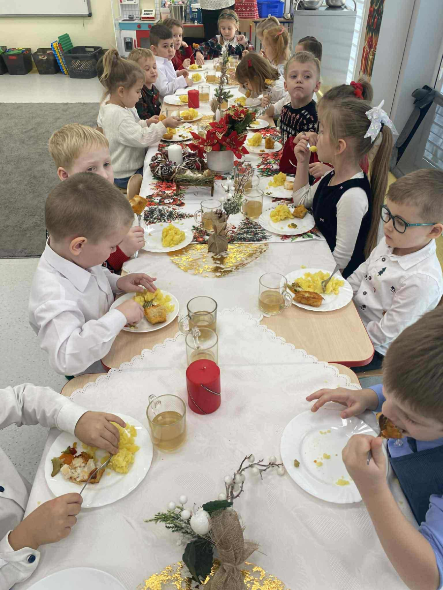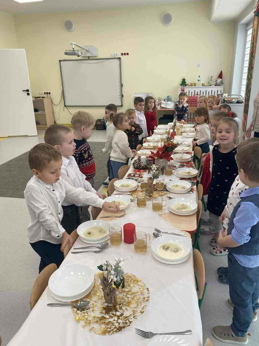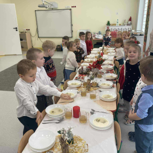 W naszym przedszkolu odbyło się uroczyste spotkanie wigilijne, które wprowadziło dzieci i nauczycieli w magiczny, świąteczny nastrój. Przedszkolaki z radością kolędowały, dzieliły się życzeniami oraz uczestniczyły we wspólnym wigilijnym poczęstunku przy pięknie udekorowanym stole.